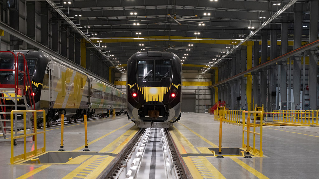 In addition to the line and station facilities, Brightline’s Orlando footprint includes a locomotive repair shop, which it calls a “vehicle maintenance facility,” that is 135,805 square feet, a 9,542-square-foot train washing facility, and 7.75 miles of maintenance and storage track, all on a 62-acre site. The locomotive shop features drop pits and a 30-ton overhead crane, and the facility can support heavy repair on both locomotives and cars.