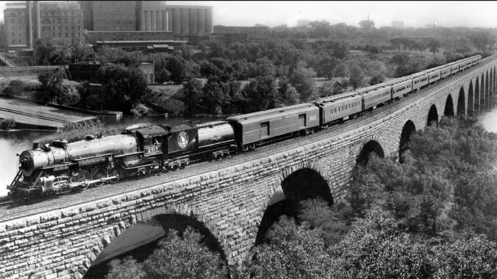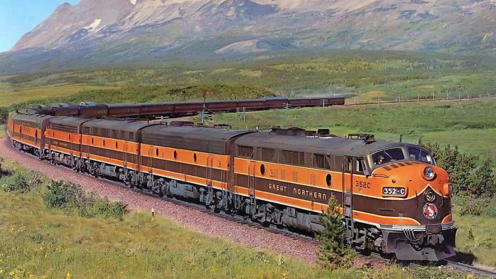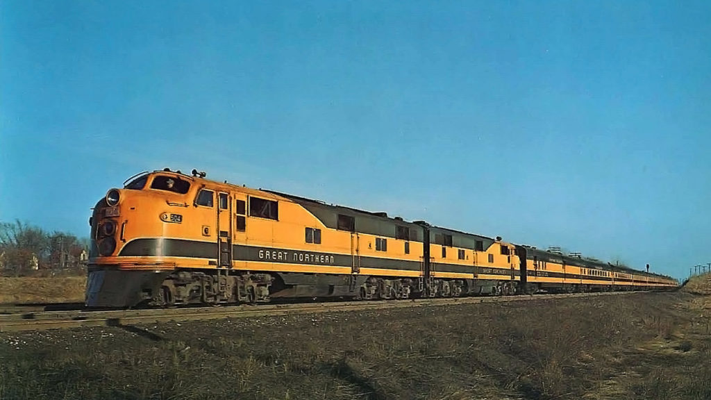 When Great Northern debuted the Empire Builder as Western America’s newest streamliner in February 1947, the train operated on a 45-hour schedule between Chicago and Seattle, with seven hours of equipment turnaround time in Seattle and 23 hours in Chicago for its five sets of equipment. (Necessary passenger car modifications were done on the eastbound train at St. Paul.) The train was specifically scheduled for immediate connections to and from the East and South in Chicago, with early morning (eastbound) and late night (westbound) departures at Minneapolis, and train times in Spokane just prior to midnight in both directions. This equipment rotation remained in place until the inception of Amtrak in 1971, including a seven-hour or more turn time in Seattle. When an inbound consist was exceptionally late, GN (starting in 1951) also had the option of substituting equipment off its second streamliner, the Western Star, to protect an on-time eastward departure. As an Amtrak train in 1971, the Empire Builder underwent schedule and frequency changes (operating only three and four days per week at times), which usually did not allow the same-day turn of equipment at Seattle.
