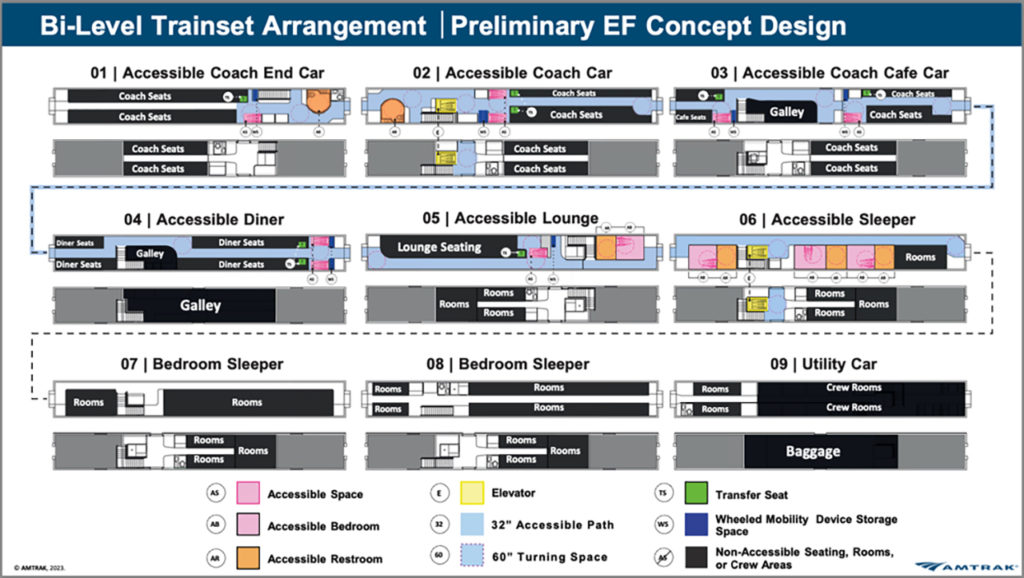 As Sept. 30, the end of its 2023 Fiscal Year, rapidly approaches, Amtrak has precious little time to firm up design specs and place an order for what appears to be a complete redesign of the long-distance (LD) passenger service. The IIJA (Infrastructure Investment and Jobs Act) provided five fiscal years of advance authorized funding for which Amtrak has, at most, three years left to obligate. The railroad has previewed an integrated trainset design based on 10-car single-level and nine-car bilevel consists focused upon accessibility, but did not address other critical issues.