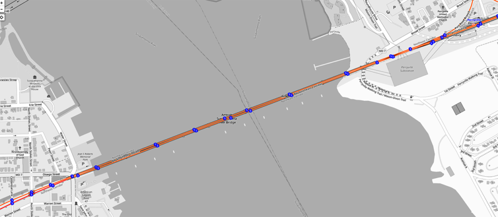OpenRailwayMap.org detail of the existing Susquehanna River Bridge. The ten white objects next to the span are the remnant bridge piers.