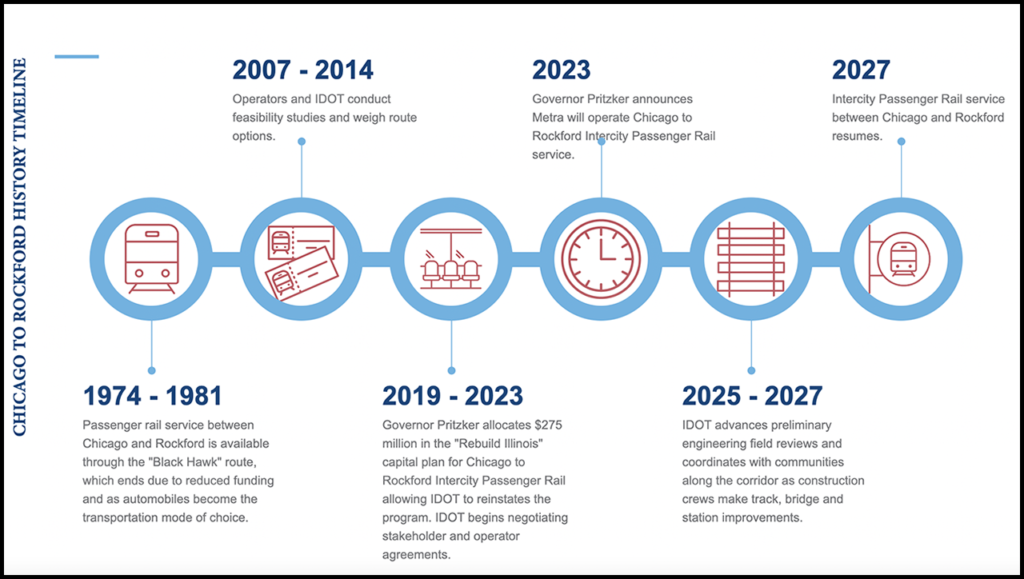 With these improvements, travel time is expected to be slightly less than two hours between Chicago and Rockford, with two round trips per day planned, according to the Governor’s Office. Boarding locations in Chicago and Rockford, as well as a fare structure and schedule, are still to be determined.