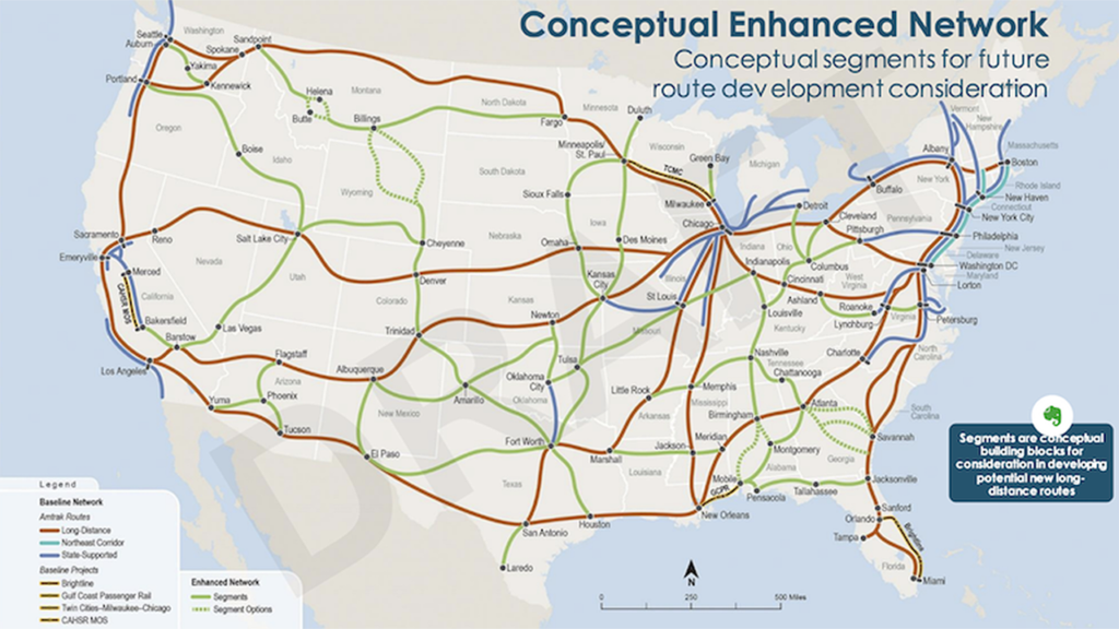 While this latest version of the FRA L-D study is short on specifics, it does send a message about the financial consequences of arbitrarily choosing speculative new passenger train routes without existing freight infrastructure to support them. Hopefully, the FRA will heed its own study, and focus on expanding passenger rail service first on existing routes—even beyond making the Sunset Limited and Cardinal daily trains. With stations and most infrastructure already in place, adding service to severely underserved routes such as New York to Chicago and New York to Florida could be accomplished with minimal investment—mostly in new equipment (again, the current study indicates as only 20% of total capital cost). By making existing routes more relevant to communities they serve (usually not the case for Amtrak’s spartan L-D “network”), a stable framework can better be developed for future sustainable new service.