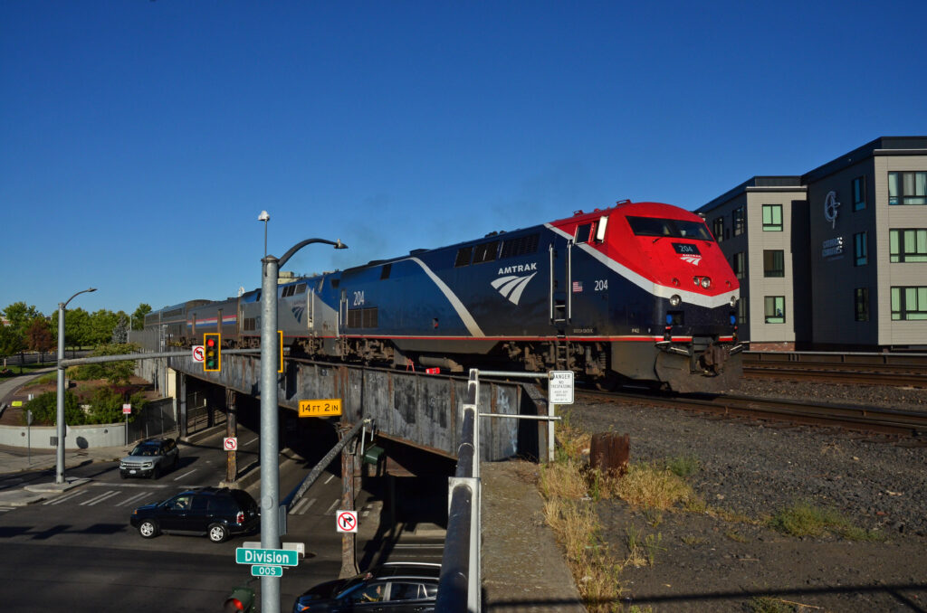 Not all delays to Amtrak trains over the past year have been directly attributed to weather or equipment malfunctions. Long-Distance trains like the Empire Builder travel thousands of miles over routes owned and operated by freight railroads, often referred to as “host” railroads by Amtrak. For the Empire Builder, that means having passenger trains that are authorized for speeds up to 79 mph in some places on a route—mostly BNSF—that also carries a high volume of manifest/mixed freights, intermodals handling domestic and international containers, and unit trains carrying grain, oil, ethanol, or other bulk commodities, all of which are limited to 60 mph or possibly 55 mph depending on their tons per operative brake (TOB). West of Sandpoint, Idaho, the Empire Builder route is joined by additional traffic—much of it grain and coal—coming off the former Montana Rail Link. From Spokane westward, loaded unit trains share the same route as the Empire Builder section that splits off toward Portland, but not the section that heads toward Seattle.