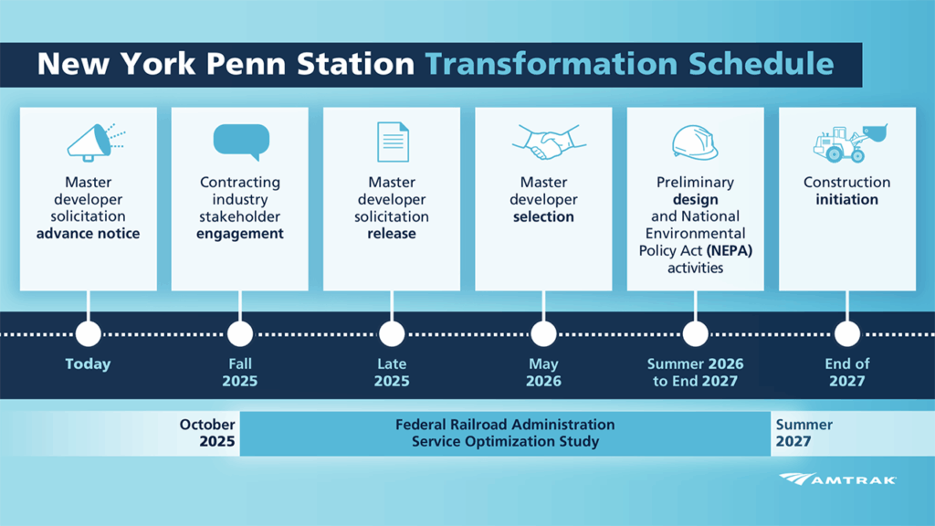 In partnership with Amtrak, USDOT reported releasing the solicitation for the project’s master developer, inviting interested parties to submit their Letters of Interest through Amtrak’s Procurement Portal; selecting Public-Private Partnership (P3) advisors Hunton Andrews Kurth LLP (legal) and KPMG (financial) and environmental consultant AKRF to help structure the project approach and agreements; and initiating the project’s Service Optimization Study to explore ways to accommodate passenger service growth at PSNY and the surrounding region.