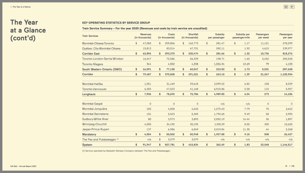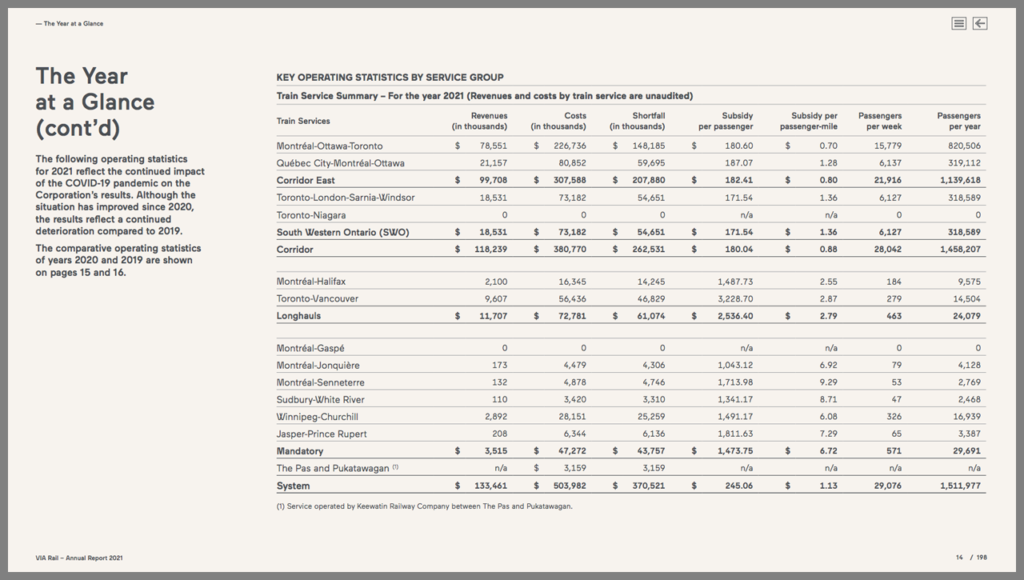 “Like many companies in the transportation industry, VIA Rail continued to face the impacts of the various waves of the pandemic,” Chief Financial Officer Marie-Claude Cardin noted in the 2021 Annual Report. “Nonetheless, as we have always done over the past two years, we found ways to strike a balance between our important public service mandate while proactively managing the financial impacts on our operations.”