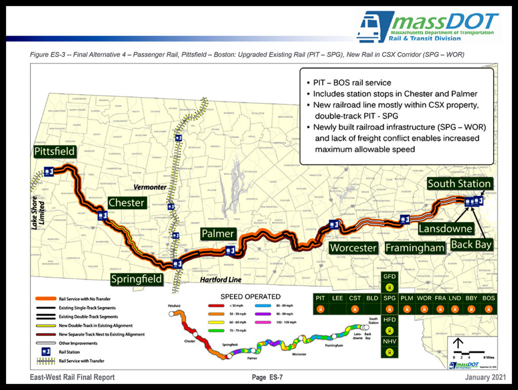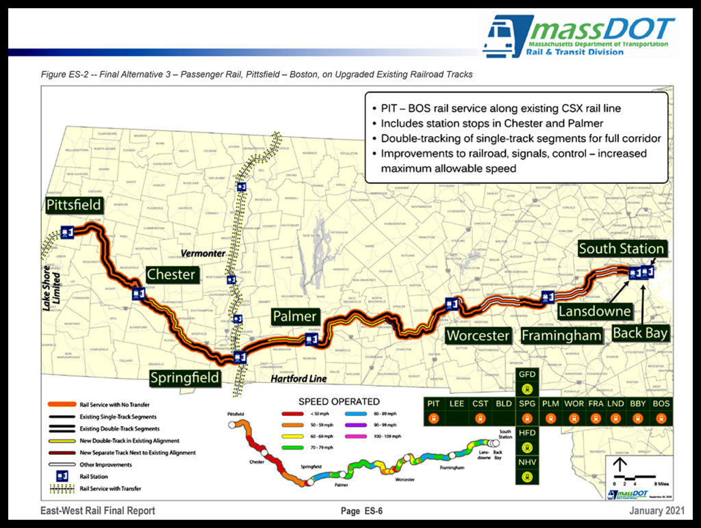 There are three alternatives for service west of Worcester, where the current regional service on the T ends. They involve a range of possibilities and expenditures ranging from slight upgrades to building some dedicated track and running at 110 mph on part of the route. A 2016 study offered six alternatives, two of which proposed service only as far as Springfield. The next study was released in January 2021.