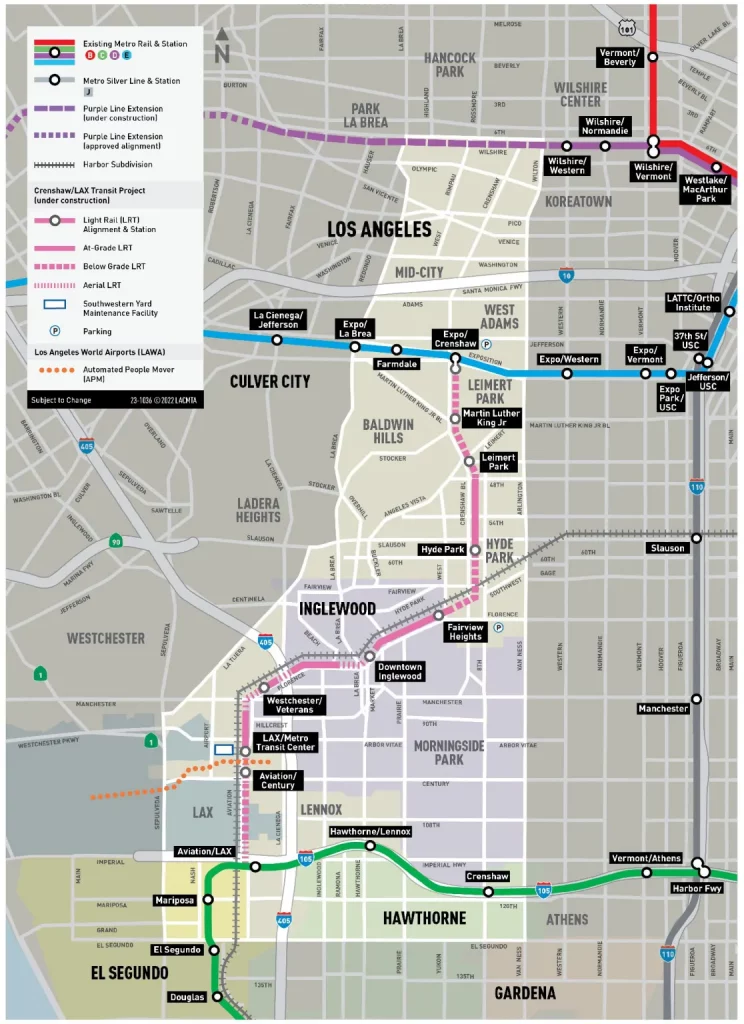 According to Metro, the K Line’s Expo/Crenshaw, Martin L. King Jr., Leimert Park, Hyde Park, Fairview Heights, Downtown Inglewood and Westchester/Veterans stations will open first. The K Line’s Aviation/Century station is projected to open in late 2023 and will provide access to Los Angeles International Airport (LAX). The LAX/Metro Transit Center Station along the new K Line tracks is planned to open in late 2024 and will provide easy transfers between Metro and the LAX Automated People Mover that will serve airport terminals, the agency says.