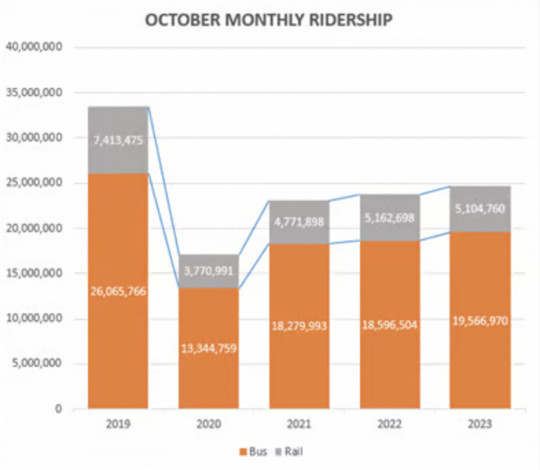LACMTA bus ridership in October 2023 saw a 12.5% year-over-year increase. Nearly 21 million rides were taken, with total bus ridership at 80% of its pre-pandemic (October 2019) level.