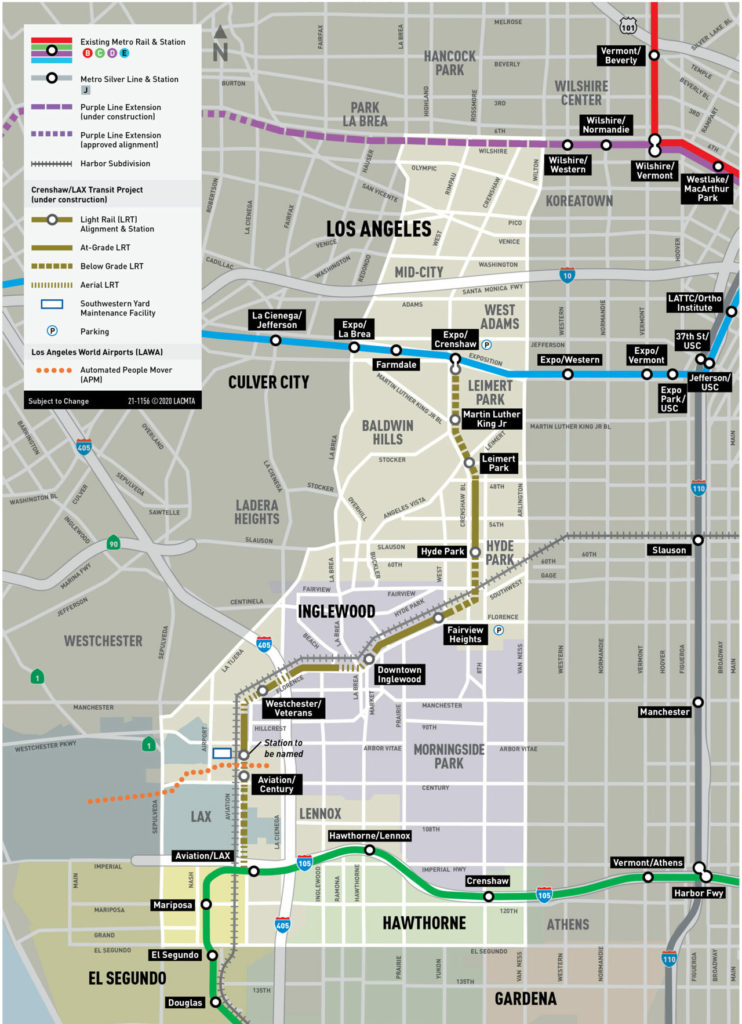 LACMTA’s approximately $2 billion, 8.5-mile Crenshaw/LAX Transit Corridor Project will extend light rail service from the E Line (Expo) at Expo/Crenshaw Station and merge with the C Line (Green) at Aviation/LAX Station, connecting the Crenshaw Corridor, Inglewood and El Segundo.