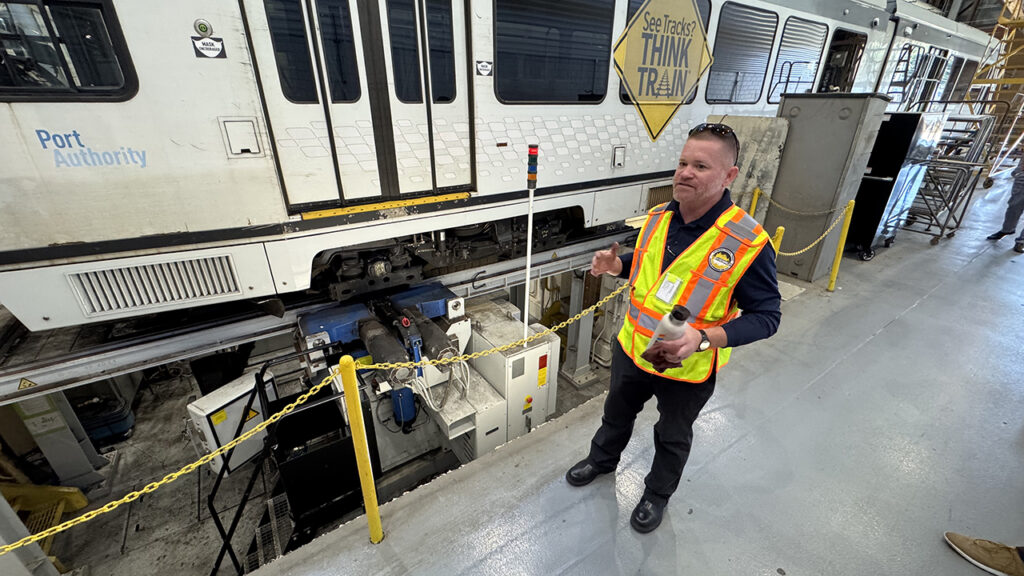 Two managers from PRT then presented talks about how the agency maintains its LRVs and operates the electrical components in its shop. Justin Selepack, Director of Rail Car Maintenance, started by describing the agency’s fleet of Siemens cars from the late 1980s (52 cars) and CAF cars built in 2003-05 (28 cars). He mentioned the uniqueness of the operation, which runs on 5-foot, 2½-inch (broad gauge) track, only used in Pennsylvania (including Philadelphia and museums) and New Orleans. He described the “running repair” (for light repairs) and “heavy repair” (for bigger jobs, up to overhauls) operations. He described recent upgrades to the vehicles, as well as other upgrades to the shop facilities at South Hills and concluded by noting that any job costing more than $10,000 requires a 14-day bid process, and any job costing more than $150,000 requires a 30-day bid process plus Board approval.