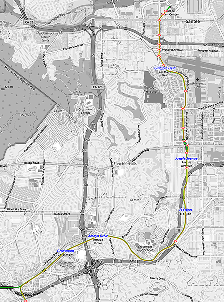 The San Diego Metropolitan Transit System (MTS) Copper Line East County Connector, which replaces San Diego Trolley Green and Orange Line service north of El Cajon Transit Center, entered revenue service Sept. 29. The new service includes four station stops—El Cajon Transit Center, Arnele Trolley Station, Gillespie Field and Santee Trolley Station—operating on 15-minute headways from 5:00 AM to 11:00 PM. Riders transfer to and from Copper Line trains at El Cajon Transit Center, where the Green and Orange Lines now terminate.