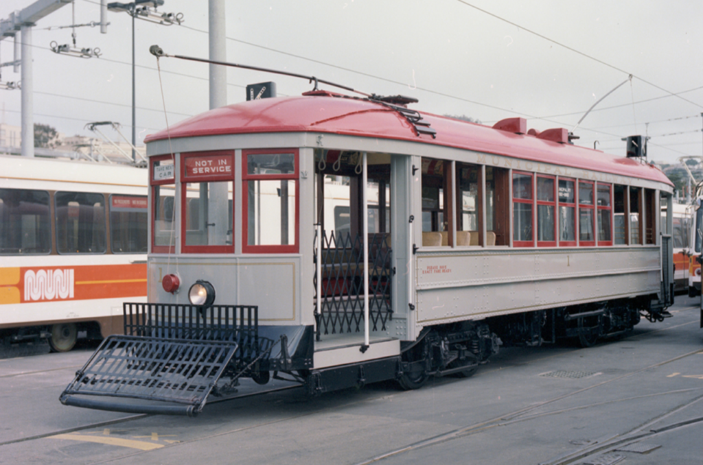 Seen here at Green Division rail yard around 1980, Streetcar 1 was built in San Francisco in 1912. It has been restored and operates today during special events. (Caption and Photograph Courtesy of Muni)