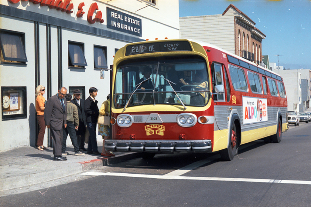 This photo from 1969 shows a new GM bus with Muni’s fresh logo and paint job. Today, Muni has one of this type of bus in its vintage bus fleet. (Caption and Photograph Courtesy of Muni)