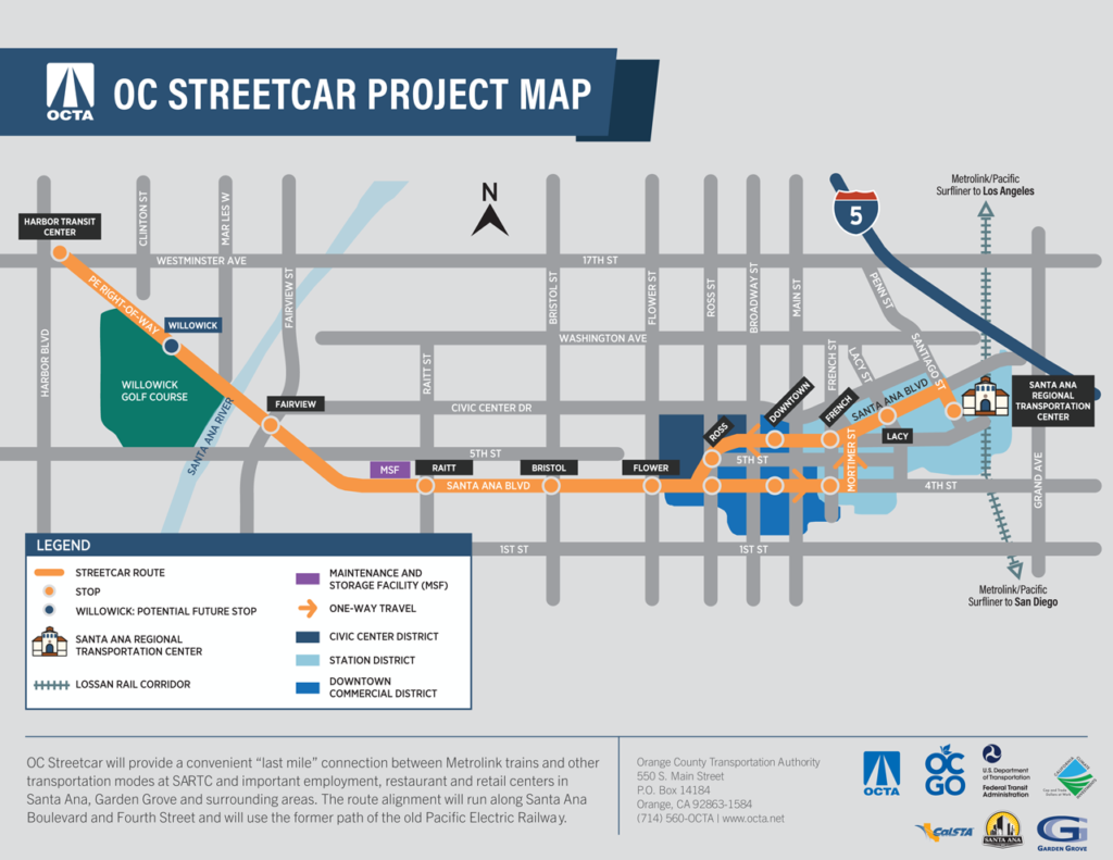 The LRVs will carry riders between the Santa Ana Regional Transportation Center (SARTC) and a new transit hub at Harbor Boulevard and Westminster Avenue in Garden Grove, running along Santa Ana Boulevard, Fourth Street and the Pacific Electric right-of-way, and connecting with OCTA bus routes as well as Amtrak and Metrolink commuter rail (see map below).