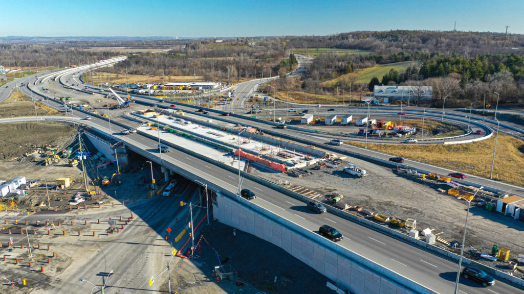 Part of the busway is on the right-of-way of Canadian Pacific’s (CP) former main line west from Ottawa to Toronto and Western Canada. The LRT also parallels Highway 417, the main highway into Ottawa from the west. Conversion of the busway (known as the Transitway) to LRT involves upgrading stations, removing bus access roads, constructing diversion roads for buses, and in some cases building a new bridge, as at Holly Acres Road.