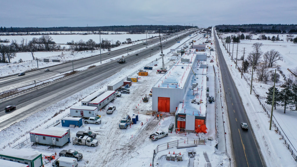 Work should be in progress on all the new stations by the end of 2022; most are in the early stages of construction. A new Light Maintenance and Storage Facility has been built just west of Moodie terminal station; most of the buildings are already complete. The yard will accommodate 24 LRVs initially, with the potential for a phased expansion of 90 cars ultimately. However, Belfast Road, located just east of downtown Ottawa, near the approximate center of the system, will remain the heavy maintenance shop. It has a siding connection to an adjacent VIA Rail Canada line, for possible future LRV deliveries. The Alstom plant in Brampton, although beside a railway, no longer has a connection.