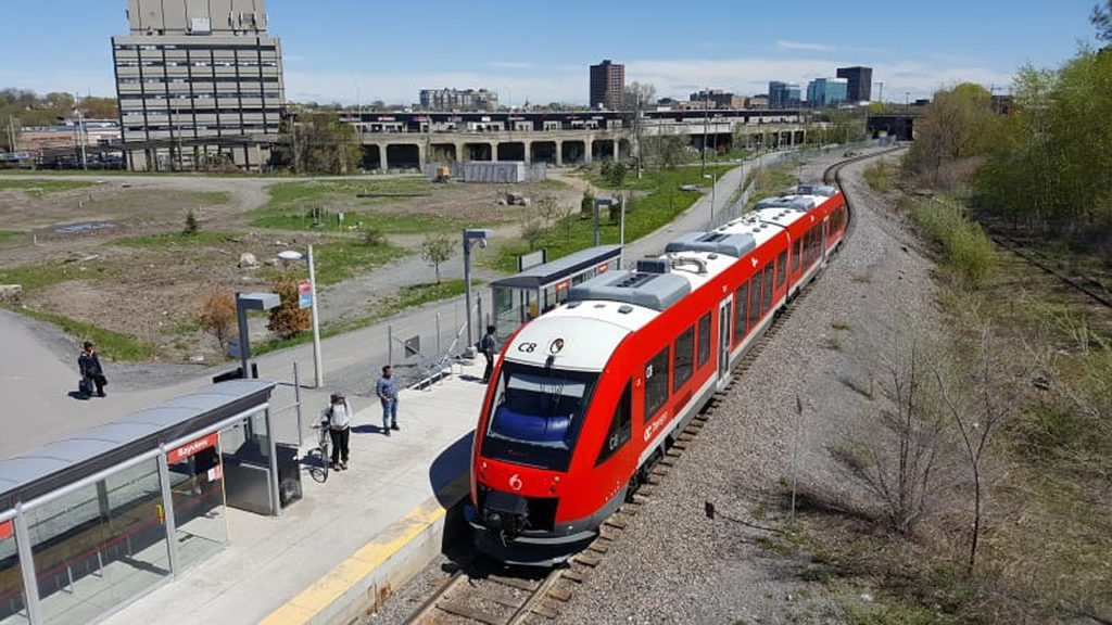 The DMU Trillium Line’s (the trillium is Ontario’s Provincial Flower) extensions will serve the Macdonald-Cartier International Airport (via a newly-built branch) and, on the main line, the rapidly-developing Riverside South housing development near the Limebank terminal station, beyond the present terminal. In total, 16 kilometers (9.94 miles) of track and eight stations will be added to the operation. Construction began on May 3, 2020, necessitating that the 8-kilometer (4.97-mile) original line be temporarily closed for the duration, with replacement bus service.