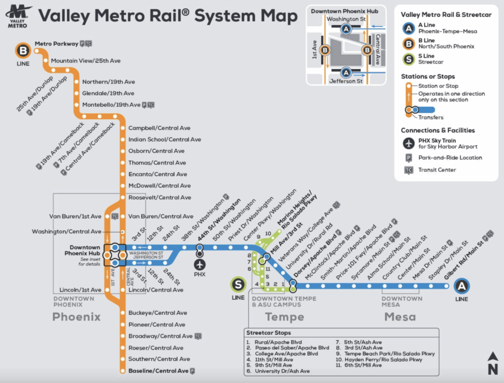 More than 5,000 community members, along with federal, state, and local officials, gathered to celebrate the completed project that connects the existing light rail system in downtown Phoenix and operates 5.5 miles south to Baseline Road (see map, right; scroll down for full map). The project also includes eight stations with a hub in downtown Phoenix (see map below). The A Line now travels east/west between Gilbert Road/Main Street in Mesa and the Downtown Hub; the B Line travels north/south between Metro Parkway in northwest Phoenix and the new end-of-line station at Baseline Road/Central Avenue. The Downtown Hub comprises four platforms on Washington, Jefferson, Central, and 1st avenues where riders will transfer between the A and B lines.