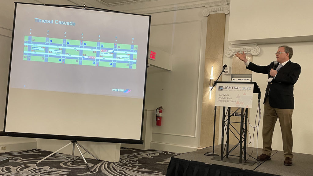 The next presentation focused on Houston’s light rail system, with Ken Luebeck, Houston Metro’s Director of Operational Engineering. He described in detail the system that Metro uses to integrate the signal system on the LRVs with street traffic signals on the 27 intersections on the rail line in downtown Houston. The object is to synchronize train movements to avoid conflicts with vehicles on the streets, which would also avoid delays of up to 29 seconds at each intersection. As part of his presentation, Luebeck described in detail each event that occurs with every train at each intersection.