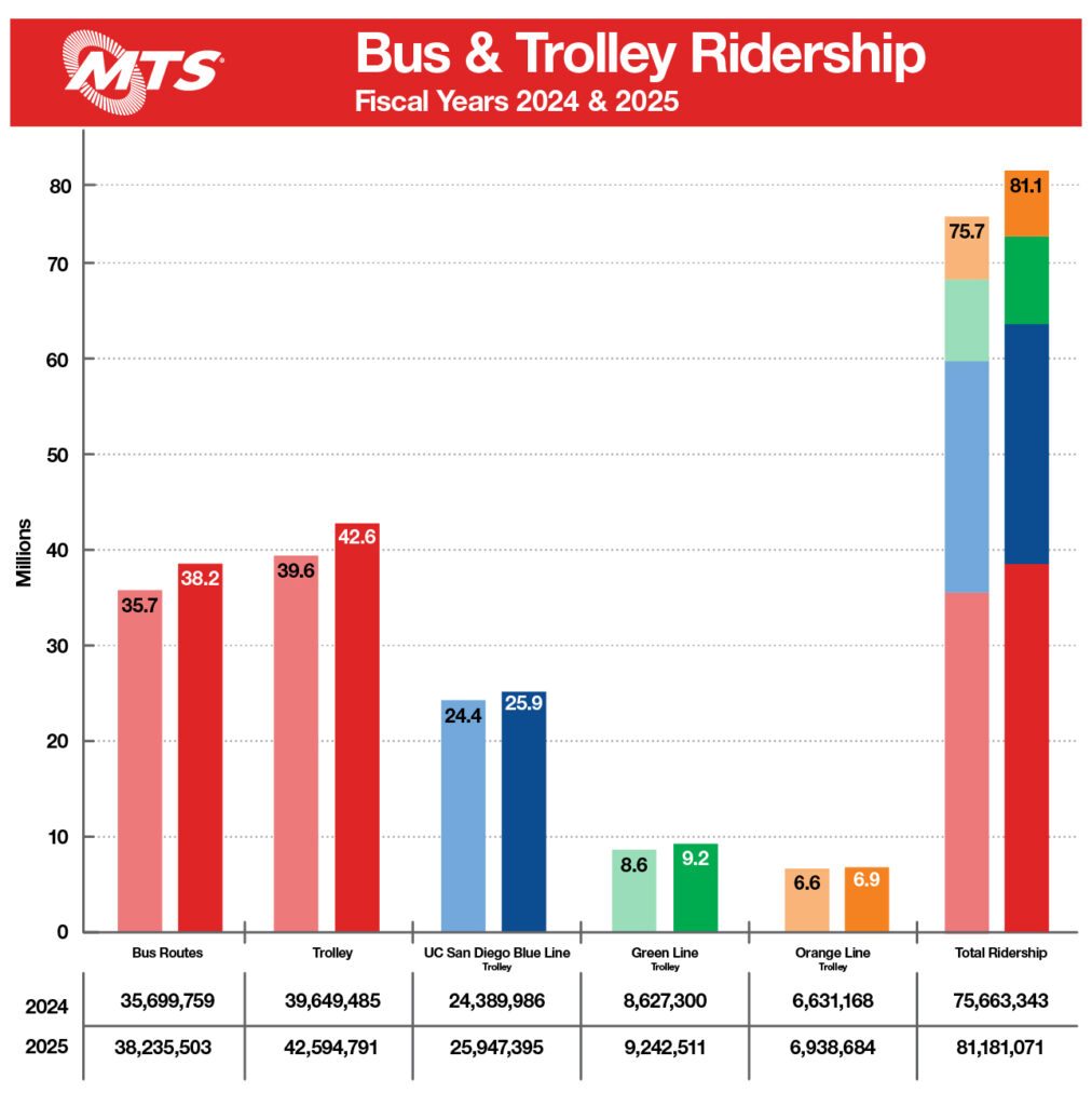 The San Diego Metropolitan Transit System (MTS) on Aug. 20 announced that annual ridership surpassed 80 million passenger trips for the first time since the pandemic. The transit agency recorded 81,181,071 boardings during Fiscal Year 2025 (July 2024-June 2025), a 7.1% increase from the 75,663,343 trips taken in Fiscal Year 2024.