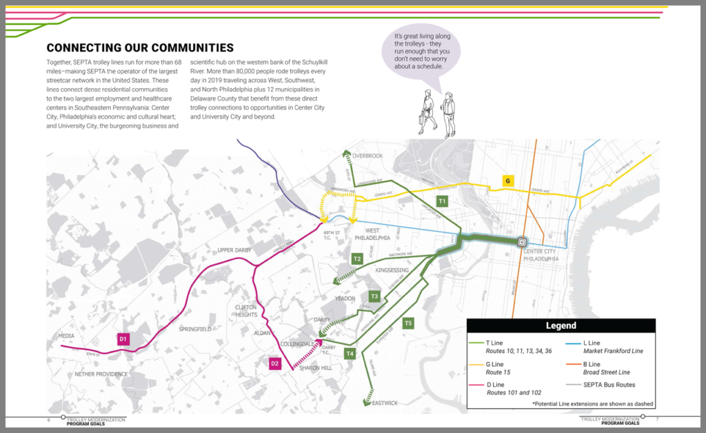SEPTA’s eight trolley lines run for a total of 68 miles and connect communities in west Philadelphia, southwest Philadelphia, north Philadelphia, and Delaware County with the region’s two largest employment and healthcare centers, Center City and University City. (See map below.)
