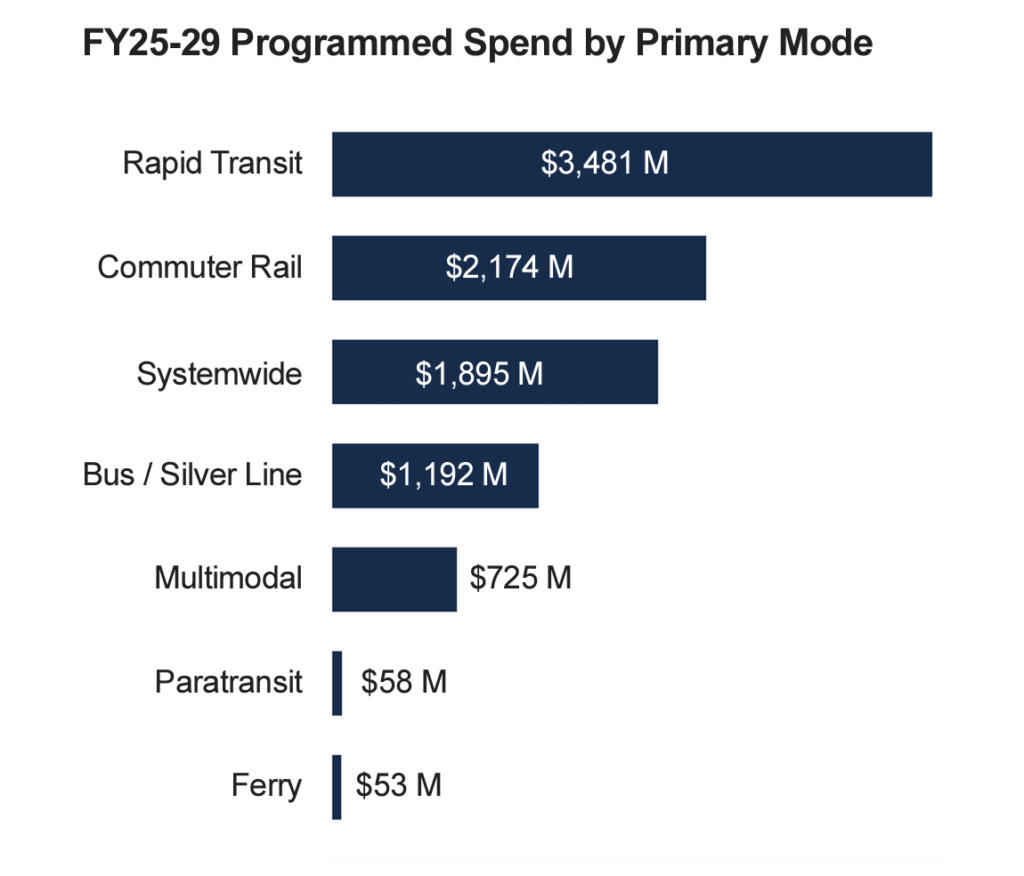 The proposed FY 2024-29 CIP (download below) includes more than 630 unique projects slated to modernize, improve, and increase the safety and reliability of MBTA’s transit network. They account for a proposed programmed spend of $9.6 billion over the next five fiscal years, which includes $843 million in new funding assigned to both existing and new projects.