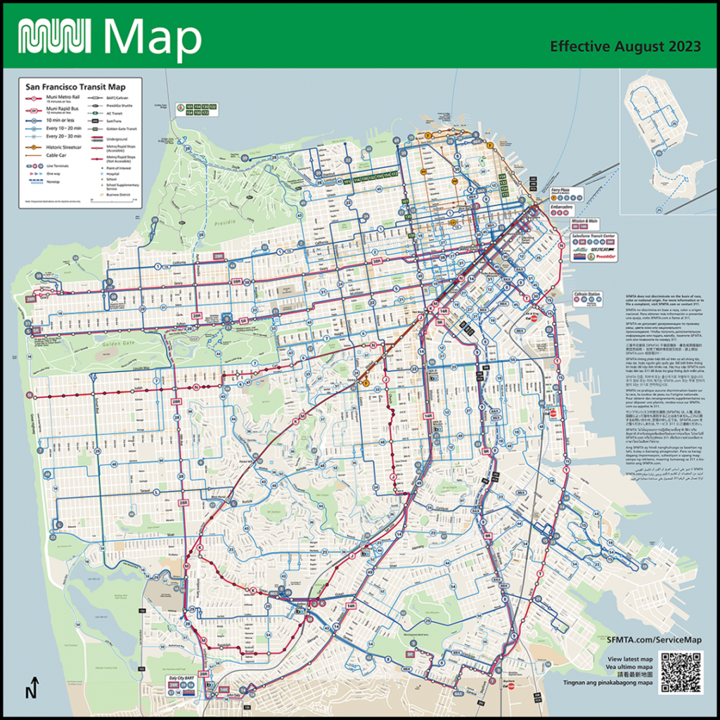 Ridership continues to recover from the effects of the COVID-19 pandemic and ended last year with 71% of pre-pandemic (2019) ridership, reported SFMTA, which has oversight of Muni, including Muni Metro, Rapid Bus, Historic Streetcar, and Cable Car services (see map below). Weekday ridership is at 68% of 2019, while weekend ridership is at 86% of 2019.