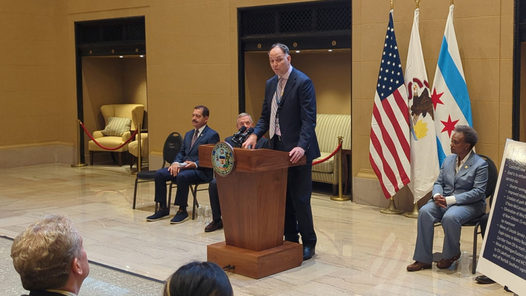 U.S. Senate Majority Whip Dick Durbin (D-Ill.); Chicago Mayor Lori E. Lightfoot; U.S. Rep. Jesús “Chuy” García (D-Ill.-4); Amtrak CEO Stephen Gardner; Illinois Department of Transportation (IDOT) Secretary Omer Osman; Metra CEO/Executive Director Jim Derwinski; Cook County (Ill.) Department of Transportation Superintendent Sis Killen; and other government, labor, business and environmental officials gathered at the station July 7 to announce their alliance. The aim: “to get this essential project across the finish line,” Sen. Durbin said.