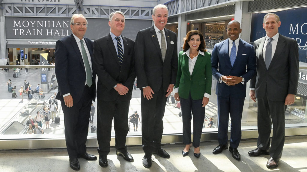 Governors Kathy Hochul of New York and Phil Murphy of New Jersey on June 9 were joined by New York City Mayor Eric Adams and New York MTA Chair and CEO Janno Lieber at Moynihan Train Hall to announce the solicitation of proposals to renovate Penn Station. Pictured (left to right): Amtrak Chair Anthony Coscia, New Jersey Transit President Kevin Corbett, Gov. Murphy, Gov. Hochul, Mayor Adams and Chair Lieber. (Photo Courtesy of Marc A. Hermann / MTA)