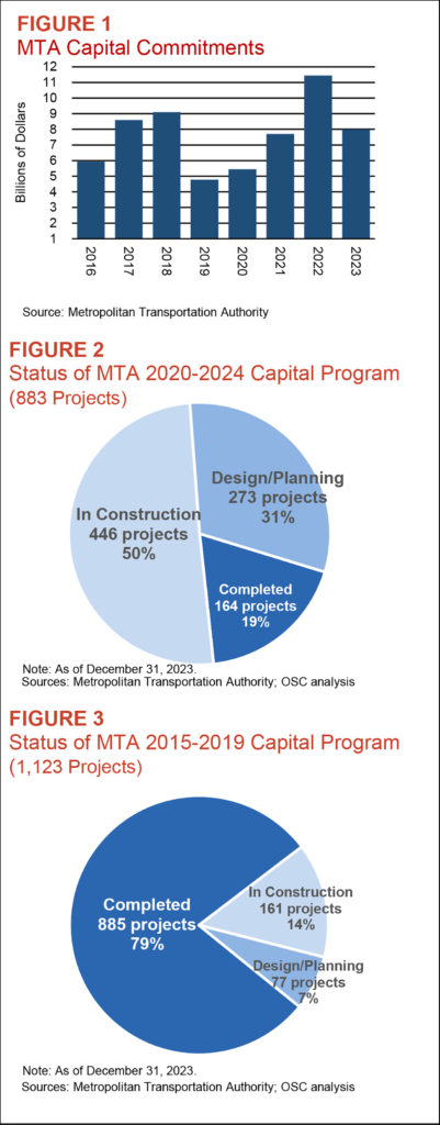 As outlined in prior Comptroller reports, “numerous parts of the MTA’s system are in poor condition, and the MTA relies on debt to pay for the capital improvement projects to maintain and repair the system. Delays, uncertainties, and lawsuits around congestion pricing’s implementation have slowed down the MTA’s capital work. Before the pandemic, the MTA averaged $7.1 billion in commitments to capital projects (2016-2019). In 2022, it put a record $11.4 billion toward capital work. However, those commitments slipped to $8 billion last year and the MTA’s target for 2024, once estimated at $12 billion, is now less than $3 billion.