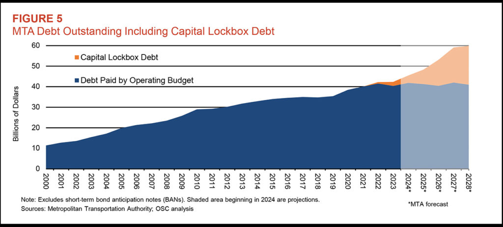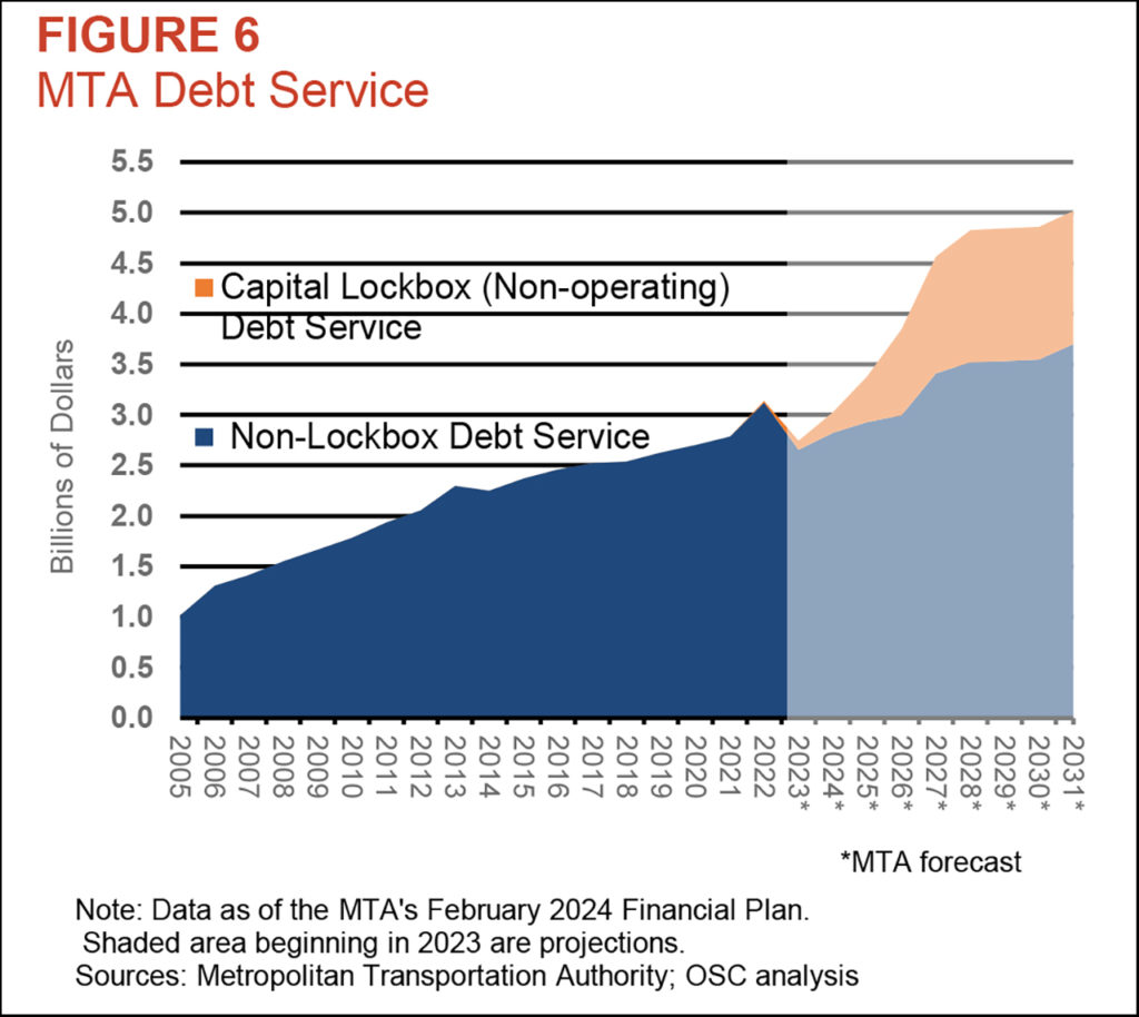 Non-lockbox debt, which impacts the day-to-day operating budget, comprises $40.4 billion of all debt in 2023 but is estimated to decline to $38 billion in 2030 as the MTA “increasingly relies on lockbox debt,” the report points out. “This will not only help fund the capital program but also stabilize its operating budget by reducing the impact of annual debt payments on the operating budget. Debt service, which is the amount the MTA spends to pay down debt each year (including for lockbox debt), is projected to reach $5 billion by 2031, an 83% increase over 2023’s $2.3 billion. Historically, about 16% of MTA’s annual revenue is spent on debt. Increased use of capital lockbox debt will keep that in check. If capital lockbox debt service and revenue were not kept separate from the operating budget, the MTA would be spending nearly 20% of its revenue on debt by 2031.”