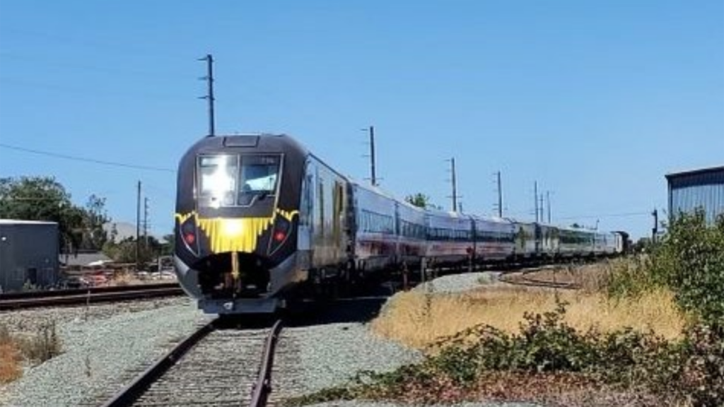 rolling stock facility in California! Let the cross-country journey begin. We’re #OnTrackToOrlando,” Brightline tweeted on July 9. (Photograph Courtesy of Brightline via Twitter)