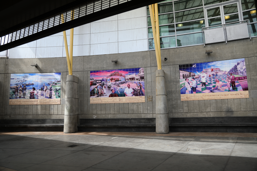 The mural, titled “On the Right Track,” features three eight-by-twelve-foot panels of durable tile each spotlighting a different aspect of Richmond history, from its original native inhabitants—the Ohlones—to current residents.