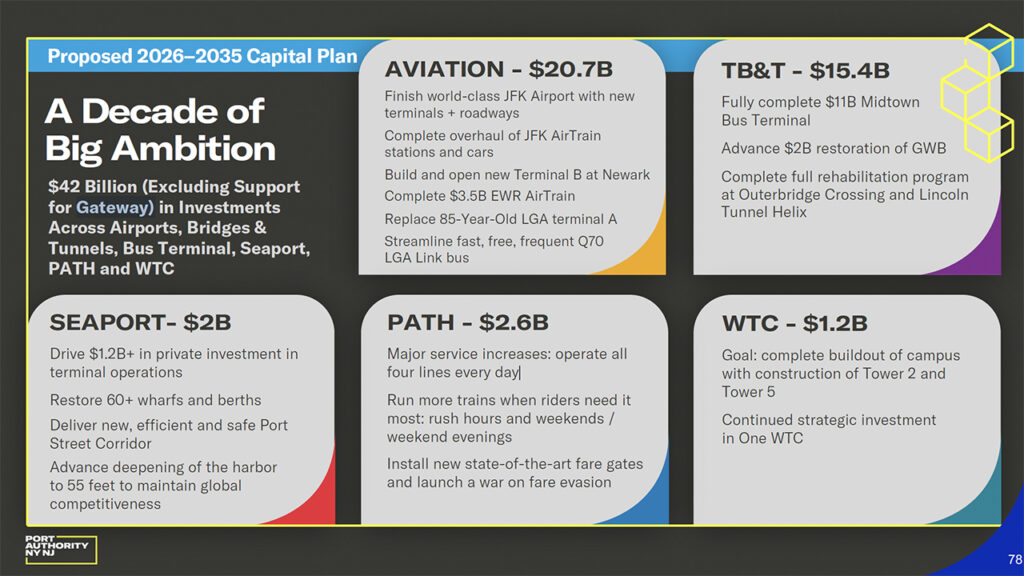 “This proposed 2026-2035 Capital Plan is about building on real, measurable progress and delivering the next chapter of transformation across our facilities,” PANY/NJ Executive Director Rick Cotton said. “Over a decade of achievement, we’ve turned once-doubted visions into tangible, award-winning results, from world-class airport terminals and new bridges to a revitalized PATH system, and we are not letting up.”