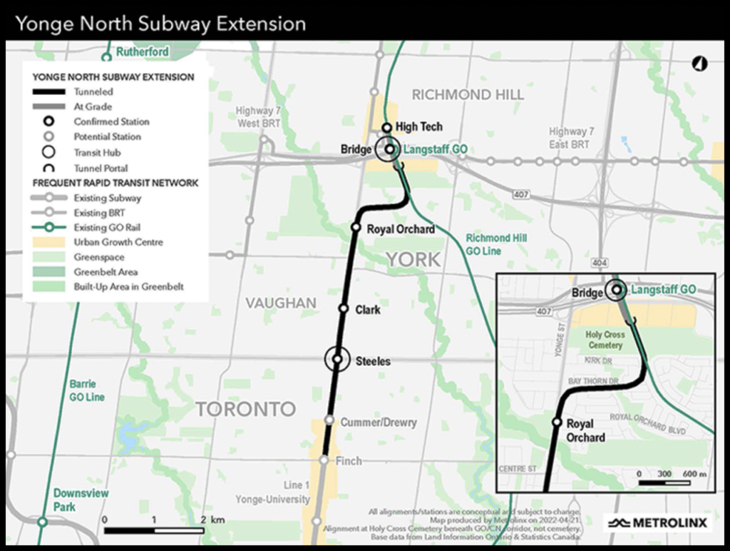 The roughly C$5.6 billion Yonge North Subway Extension will extend TTC’s Line 1 subway service 4.6 miles (7.4 kilometers) from the existing terminus at Finch Station into the city of Richmond Hill (see map above). This cross-jurisdictional project spans the city of Toronto and York Region, including sections within the cities of Markham, Vaughan and Richmond Hill. It is slated to include five stations and an approximately 3.9-mile (6.3-kilometer) underground tunnel segment, and to connect with local (VIVA BRT) and GO transit (Richmond Hill Line) services upon completion, which is expected after the 9.9-mile free-standing Ontario Line project wraps up.