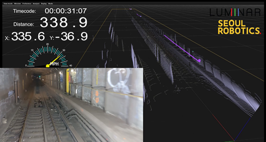 Luminar, in partnership with Seoul Robotics, deployed its 3D LiDAR with Seoul Robotics’ perception software to locate trains to within 1 meter in GPS-denied areas. “With accurate train positioning, the MTA could run trains closer together and reduce headways,” Transit Tech Lab said. “The solution also has the potential to detect track hazards and infrastructure damage.”