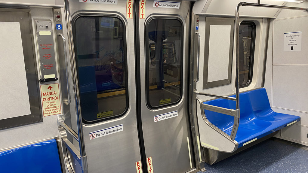 The interior of one of PATH’s new Kawasaki-built rapid transit cars. (Credit: PANYNJ)