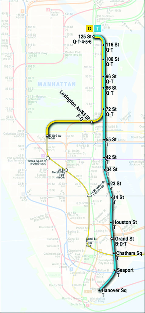 The completed SAS (in blue) will connect Harlem–125th Street to Hanover Square in Lower Manhattan. Service will be designated as the T Train. New York MTA map.