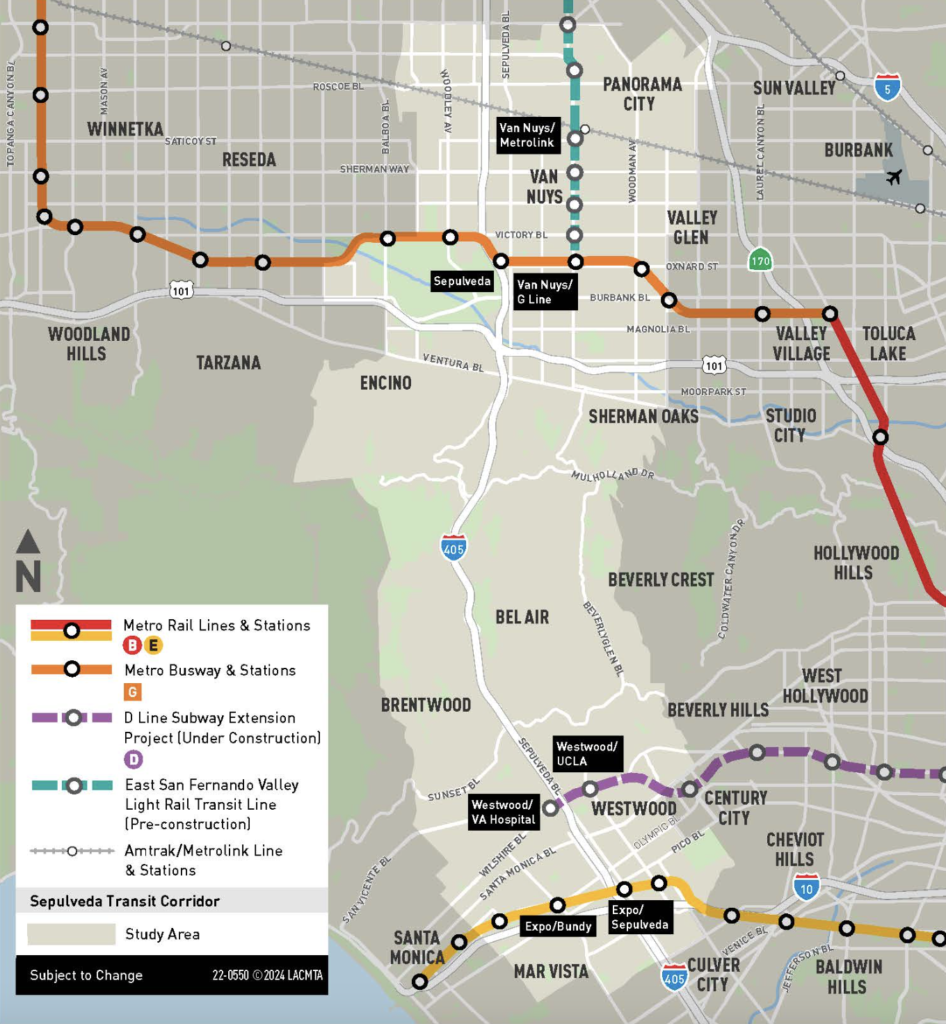 Metro is currently in the environmental review phase of the Sepulveda Transit Corridor Project, which began with scoping meetings held in late 2021/early 2022. It is also advancing technical studies in support of the development of a Draft Environmental Impact Report (DEIR), pursuant to the California Environmental Quality Act (CEQA), to evaluate project alternatives that address the transportation needs of the Sepulveda Corridor. According to Metro, the Draft EIR release is anticipated for early 2025, “assuming receipt of all technical documents from the design teams.” Additionally, Metro said it is developing a Planning and Environmental Linkages (PEL) study “as a collaborative approach” with the Federal Transit Administration “to engage federal agencies early in the environmental process and identify potential issues that will be further studied during the development of the project’s Environmental Impact Statement (EIS) pursuant to the National Environmental Policy Act (NEPA).”