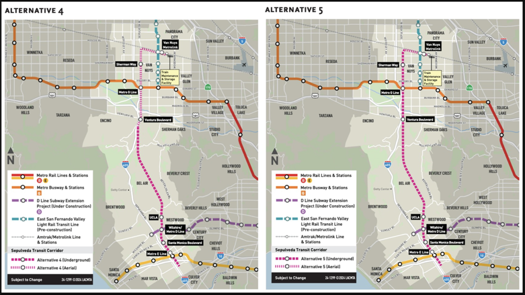 STCP is developing what Metro refers to as Alternatives 4 and 5 (see maps below and scroll down to download a fact sheet). “These are high-capacity rail lines that would provide fast, green and connected transit taking riders between the Valley and the Westside, including a station in the heart of the UCLA campus, in less than 20 minutes,” according to STCP. “Alternatives 4 and 5 are both within the same travel corridor. Alternative 4 would run above ground between the Van Nuys/Metrolink station and the proposed station at Sepulveda and Ventura. Alternative 5 is entirely below ground except for the northern terminus of the line at the existing above ground Van Nuys/Metrolink Station … The decision on whether to pursue Alternative 4 or 5 or another option is Metro’s. Alternatives 4 and 5 would be integrated with Metro’s current and future transit system, with direct connections to the D, E, G Lines (previously known as the Purple, Expo and Orange Lines), Metrolink, Amtrak and multiple bus lines.”