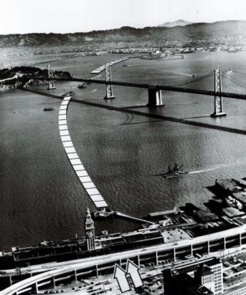 After multiple seismic studies, a soil investigation program, and even the installation of an earthquake recording system on the floor of the Bay, a preliminary route was selected that would avoid as much bay bedrock as possible. Actually, the route wasn’t that far off from the one Emperor Norton initially proposed. The cost of the project was estimated at $132,720,000 (or about $1.4 billion in 2023 dollars) and was to be financed by toll revenues.