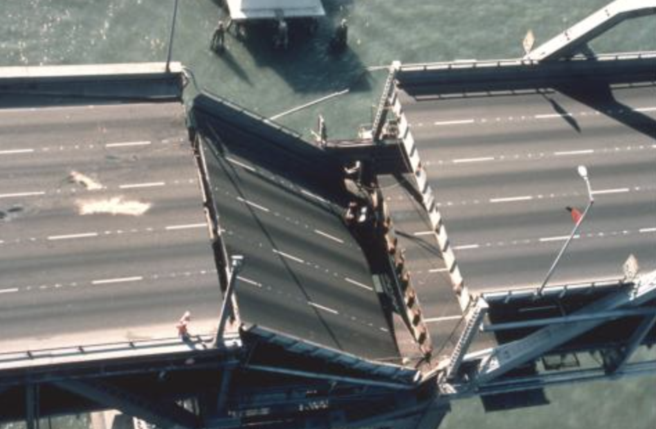 Then there was the San Francisco-Oakland Bay Bridge. A 76-foot-by-50-foot section of the upper deck fell onto the lower deck, causing severe damage and one fatality. The bridge is pictured after the earthquake (right).