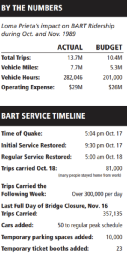 Loma Prieta and the weeks that followed are often referred to as “BART’s finest hour,” and with good reason. Staff quickly jumped to take on extra shifts so BART could run 24-hour service in the Transbay Tube, which started the day of the earthquake and ended December 3. The Bay Bridge did not reopen until November 18.
