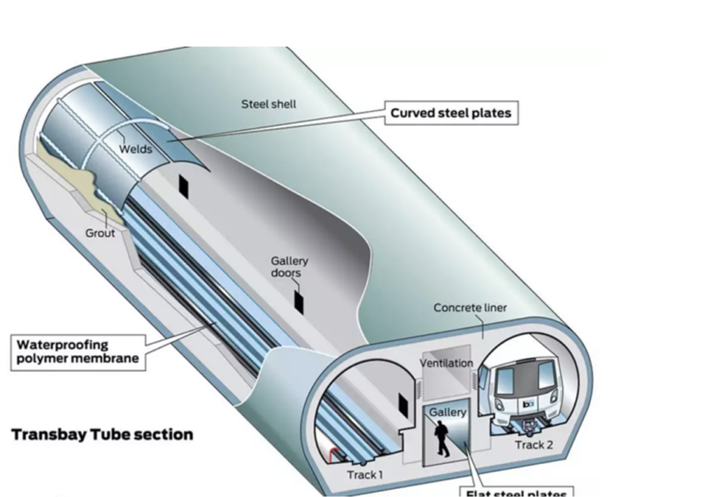 A diagram of the Transbay Tube that shows the outer steel shell, concrete liner, and steel plates that line the Tube’s interior. (Courtesy of BART)