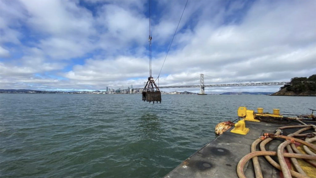 Large clamshell dredging bucket being lowered into the bay as part of soil handling operations. (Courtesy of BART)