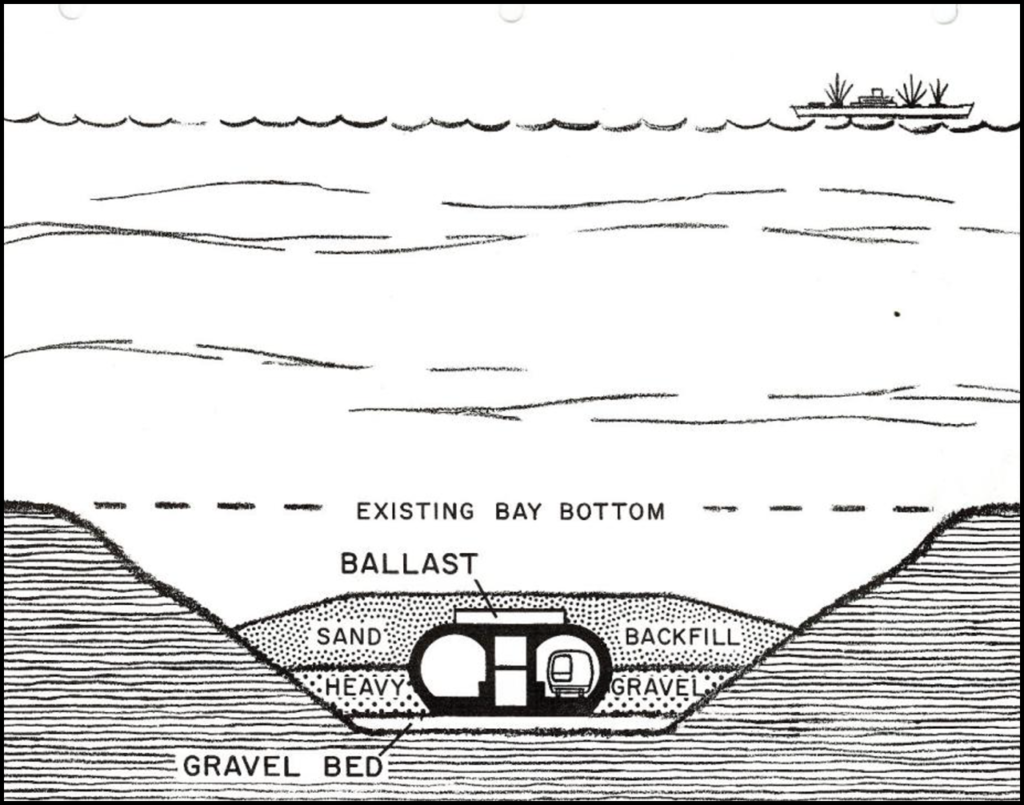 1967: A concept drawing demonstrating how the Transbay Tube would be deposited on the floor of the Bay. (Courtesy of BART)
