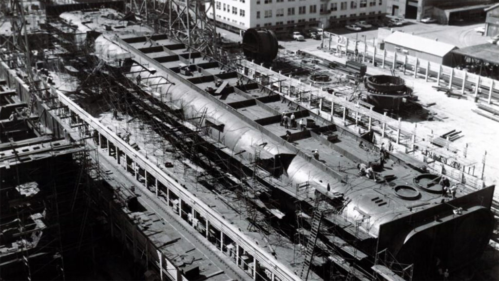 A photo of a section of the Tube under fabrication at Bethlehem Shipyards in South San Francisco. (Courtesy of BART)
