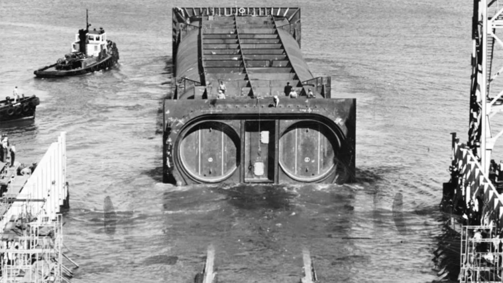 Circa 1969: A section of the Transbay Tube being floated into the Bay. (Courtesy of BART)