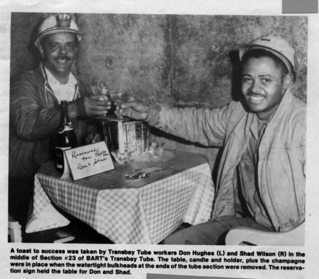 Tube sections were built from both the San Francisco and Oakland sides. When the last bulkhead was removed to finally connect the Tube, workers from the San Francisco side found Oakland-side workers Don Hughes and Shad Wilson enjoying champagne together. (Courtesy of BART)