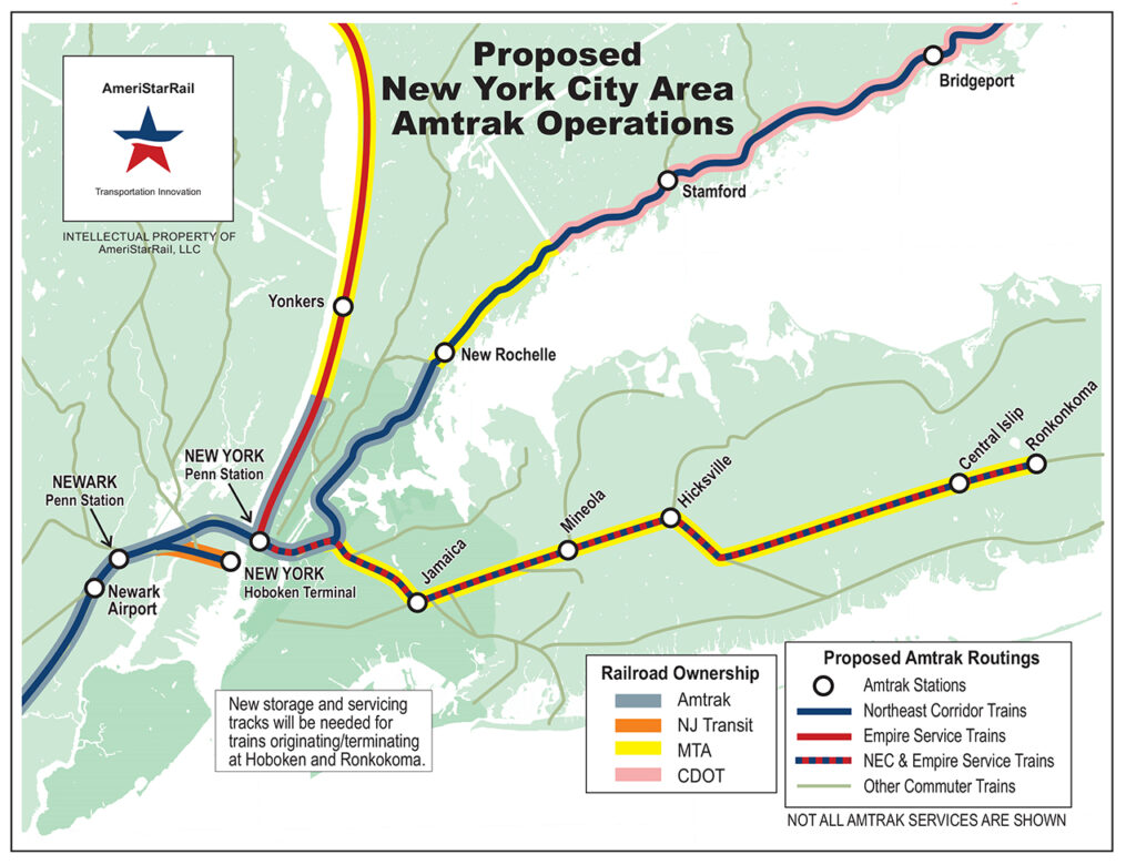 The RRWG’s Penn Station Metro-Hub Plan and the ReThinkNYC plan are concerned primarily with trains operating outside New York City, but within its region, as defined by current operations on NJ Transit, the LIRR and Metro-North. We have previously reported on AmeriStarRail (ASR) and its plan for enhanced service and operations on Amtrak’s NEC and its branches, but that company is interested in introducing through-running not only on the NEC itself, but also to places outside Amtrak’s service area.